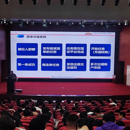 活动中,安全与保卫处陈珏孚老师以真实案例和详实的数据,向同学们介绍了盗取QQ后冒充亲友诈骗、骗子冒充公检法行骗的几种“伎俩”、刷单返利兼职、冒充网购客服、冒充熟人、冒充贷款客服、虚假投资理财平台、“校园贷”诈骗等常见电信诈骗方式,揭穿骗子常用的诈骗伎俩;细致分析了新型电信网络类诈骗类型的本质及特点,并提出了有针对性的应对防范措施,叮嘱参与此次活动的师生要牢固树立反诈骗意识,洁身自好,不贪利、不贪小便宜,切实提高识骗、防骗的能力,做到不听、不信、不转账。